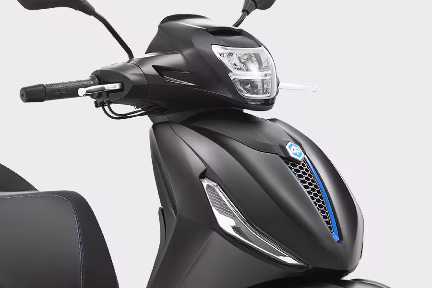 Sportovní vzhled podtrhují modré detaily - od ikonické "kravaty" na přední kapotě přes písmeno "S" v logu až po dekor na předním kole. Matná povrchová úprava rámečků, krytů a dvoubarevné černé sedlo s černým a modrým prošíváním.